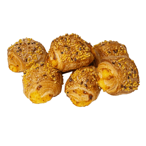 DoughINVITATION Flour, puff pastry margarine (palm fats, water, rapeseed oil, emulsifiers (E471, E322), salt, acidity regulator (E330), natural flavorings, color (E160a)), water, sugar, margarine (vegetable oils (palm, rapeseed), palm fats, water, emulsifiers (E471, E322), salt, color (E160a)). \ LIGHT flavouring), yeast, dough conditionerINVITATION emulsifiers (E471), thickener (E412), enzymes, antioxidant (E300)), salt), cheese filling 26% (grated SIERS (PIENS, salt, rennet, microbiological enzyme, firming agent (E509)), grated product with cheese flavour (water, palm fat, starch, FULL Bulking agents, salt, emulsifiers (E452, E450), acidity regulators (E330, E331), stabiliser (E407), flavouring (contains MILK), colour (E160a)), OLU salt, dried garlic granules), product finish (seed mix (linseeds, SEZAMA seeds, sunflower seeds, garlic granules, black cumin seeds), corn balls (extruded corn flour), salt, vegetable glaze (water, rapeseed oil, vegetable protein, maltodextrin, dextrose, starch)).