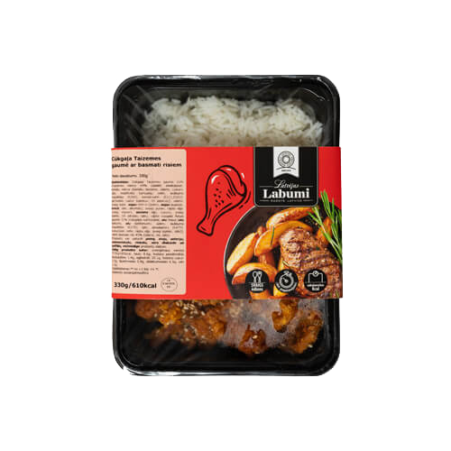 Sastāvdaļas: Cūkgaļa Taizemes gaumē 55% (Taizemes mērce 69% (saldēti ziedkāposti, tomātu mērce (tomātu biezenis, ūdens, cukurs, sāls, modificēta kartupeļu ciete, skābuma regulētājs (E260), konservanti (E211,E202), garšvielas (satur ķiplokus, čili piparus)), ūdens, svaigi sīpoli, sojas mērce (ūdens, sojas pupiņas, kvieši, sāls, alkohols), svaigi puravi, rapšu eļļa, svaigs ingvers, sezama eļļa, svaigi ķiploki, cukurs,, čili pārslas, sāls), cepta cūkgaļa Āzijas gaumē 31% (cūkgaļas karbonāde, olu masa (olu baltums, olu dzeltenums, ūdens, skābuma regulētājs (E270), sāls, emulgators (E475)), kukurūzas ciete, rapšu eļļa, svaigi ķiploki, sāls)), vārīti Basmati rīsi 45% (ūdens, rīsi, sāls).