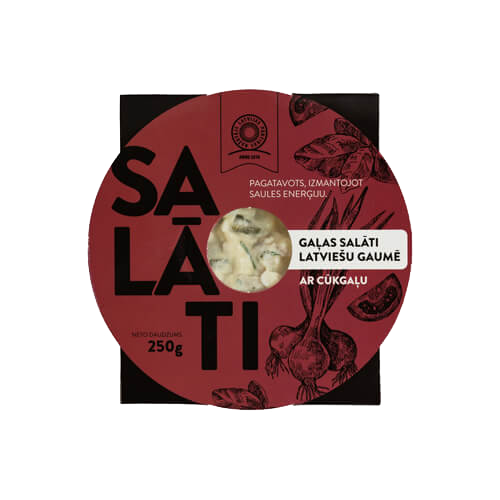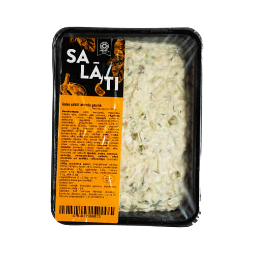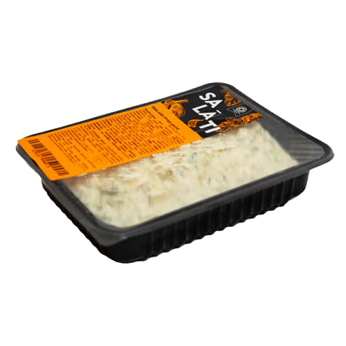 Sastāvdaļas: vārīti kartupeļi, majonēze (rapšu eļļa, ūdens, olu pulveris, vājpiena pulveris, cukurs, sāls, sinepju pulveris, skābuma regulētāji (E260,E330,E500), biezinātāji (modificēta ciete,E412,E415), konservants (E202), melnie pipari), marinēti gurķi (gurķi, brendija etiķis, sāls, konservants (E211), garšvielu ekstrakti, saldinātājs (E954)), vārītas olas (olas, sāls, skābuma regulētāji (E330, E260)), konservēti zaļie zirnīši (zaļie zirnīši, sāls), cepts cūkgaļas šķiņķis 10%, svaigi gurķi, svaigas dilles, cukurs, sāls, sinepes (ūdens, sinepju pulveris, cukurs, rapšu eļļa, sāls, skābuma regulētājs (E260), garšvielas), malti melnie pipari.