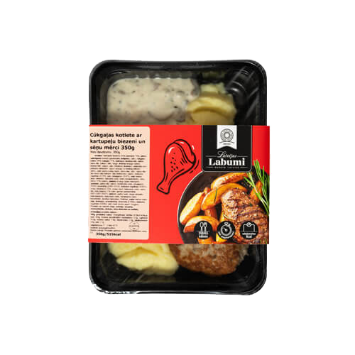 Sastāvdaļas: kartupeļu biezenis 57% (vārīti kartupeļi, piens, saldkrējuma sviests (pasterizēts krējums), sāls), cūkgaļas kotlete 23% (cūkgaļa 71%, baltmaize (kviešu milti,ūdens, rapšu eļļa, cukurs, raugs, sāls, maizes struktūras uzlabotājs (rudzu milti, miltu apstrādes līdzeklis (E300), kviešu milti, inaktivēts raugs)), ūdens, cepti sīpoli (svaigi sīpoli, rapšu eļļa, sāls), rapšu eļļa, olu masa (olu baltums, olu dzeltenums, ūdens, skābuma regulētājs (E270), sāls, emulgators (E475)), sāls, malti melnie pipari, ķimenes, dzeramā soda), sēņu mērce 20% (ūdens, paniņu un augu tauku maisījums (paniņas, palmu eļļa, ūdens, modificēta ciete, emulgators (E435), biezinātāji (E461, E415), skābuma regulētājs (E331)), svaigi šampinjoni 23%, svaigi sīpoli, kukurūzas ciete, rapšu eļļa, sēņu buljons (sāls, garšas pastiprinātāji (E621, E631, E627), laktoze, palmu tauki, rauga ekstakts, maltodekstrīns, kukurūzas ciete, šampinjonu sulas koncentrāts, žavētas baravikas, fruktoze, sojas mērce (satur soju, kviešus), aromatizētāji, krāsviela (E150c), skābuma regulētājs (E330)), sāls, malti melnie pipari, dzeramā soda, oregano)