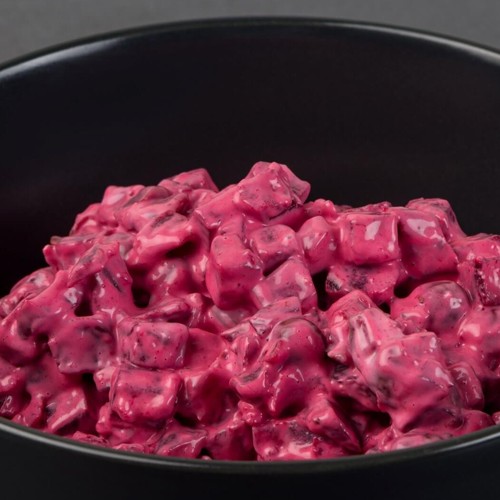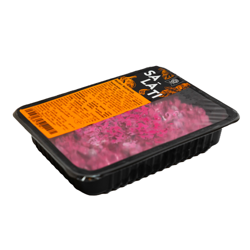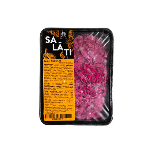 Sastāvdaļas: bietes 60%, majonēze (rapšu eļļa, ūdens, cukurs, vājpiena pulveris, olu pulveris (satur maltodekstrīnu), modificēta ciete, sāls, skābuma regulētāji (E260, E270), biezinātāji (E412, E415), konservanti (E202, E21), sinepju sēklu aromatizētājs, krāsviela: E160a), marinēti gurķi (gurķi, vīna etiķis, skābuma regulētājs:E260, sāls, ķiploki, garšvielas (dilles, sīpoli, sinepju un piparu graudi)), konservēti zirnīši (zaļie zirnīši, ūdens, sāls, cukurs), sāls, pipari melnie.