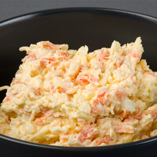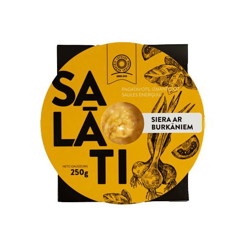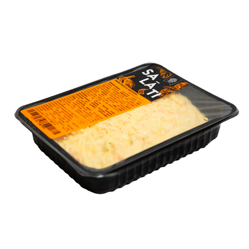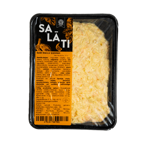 Sastāvdaļas: majonēze (rapšu eļļa, ūdens, cukurs, vājpiena pulveris, olu pulveris (satur maltodekstrīnu), pārveidota ciete, sāls, skābuma regulētāji (E260, E270), biezinātāji (E412, E415), konservanti (E202, E211), sinepju sēklu aromatizētājs, krāsviela:E160a), siers 32%(piens, pienskābes baktēriju ieraugs, sāls, cietinātājs:E509, recinātājs:ferments himozīns, krāsviela:E160a), burkāni, olas (olas, ūdens, sāls, skābuma regulētājs: E330), ķiploki 0.3%.