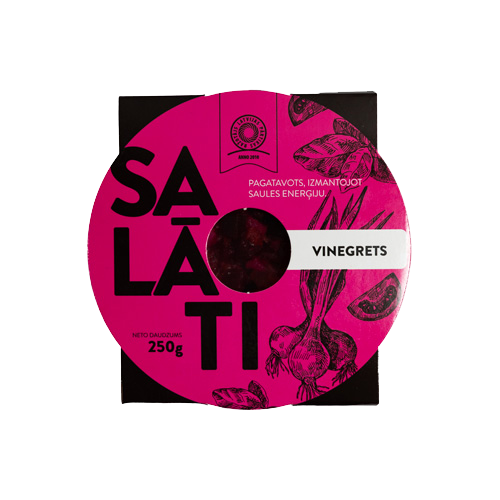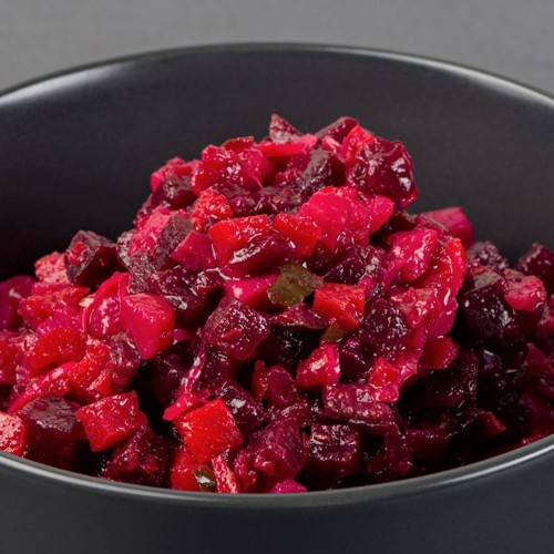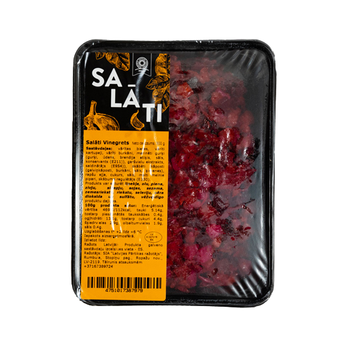 Sastāvdaļas: bietes vārītas 42%, kartupeļi vārīti, burkāni vārīti, skābēti kāposti(galviņkāposti, burkāni, sāls, ķimenes, cukurs, sāls, skābuma regulētāji:(citronskābe, etiķskābe), konservants: kālija sorbāts), marinēti gurķi (gurķi,ūdens, brendija etiķis, sāls, garšvielas (dilles, sīpoli, sinepes un pipari),konservants:E211,saldinātājs:E954, dabīgais aromatizētājs)), sīpoli, rapšu eļļa, cukurs,sāls, pipari, skābuma regulētājs: citronskābe.